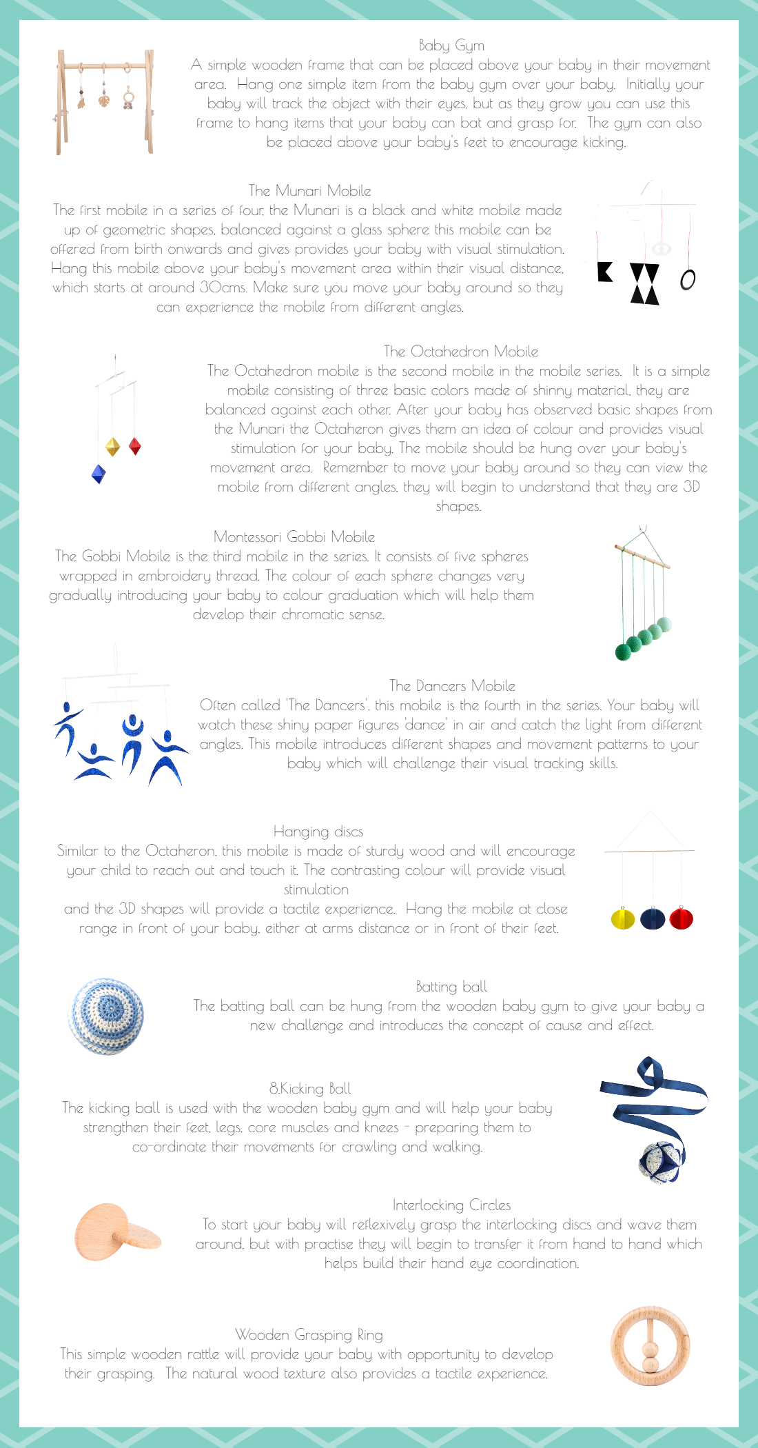 These materials will offer your baby visual, auditory and tactile experiences that will stimulate them to track, reach and grasp. Supporting development of hand eye coordination and encouraging the mind and their hand to work together.