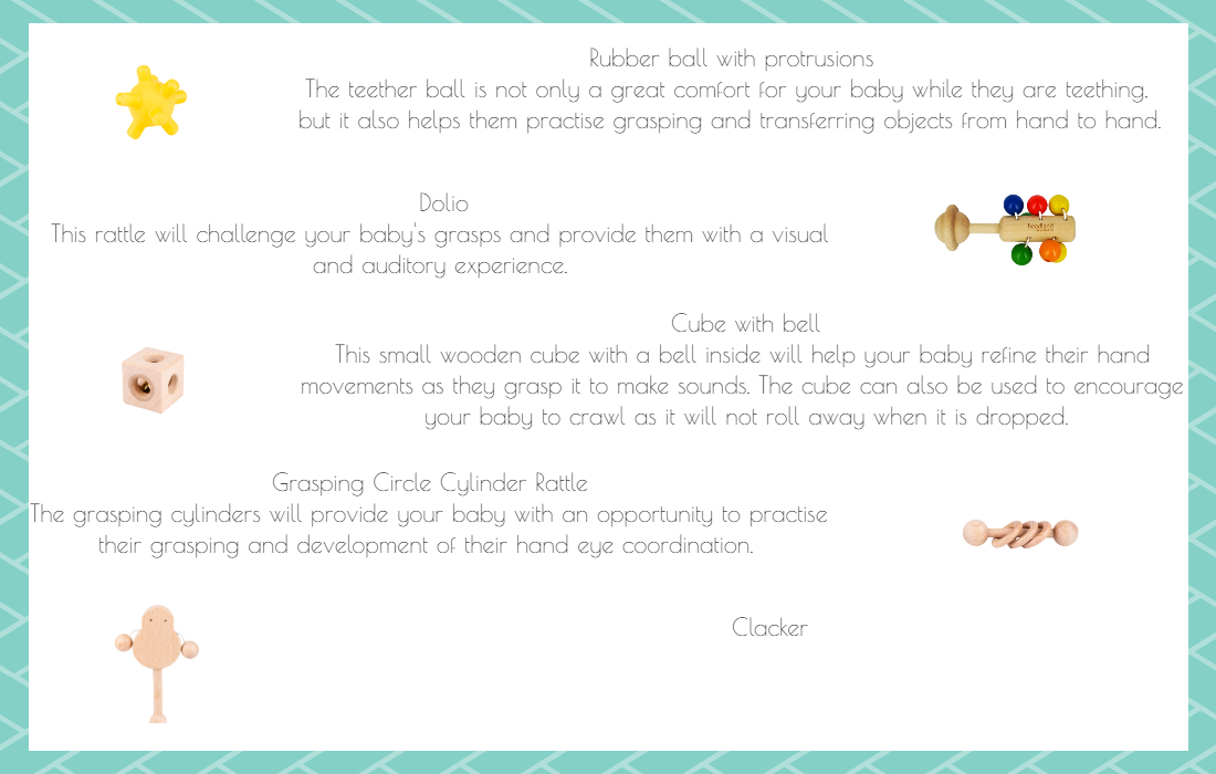 These materials will encourage your baby to reach and grasp as they begin to realise they can change their environment through interacting with these materials.  Supporting development of hand eye coordination and encouraging the mind and their hand to work together.