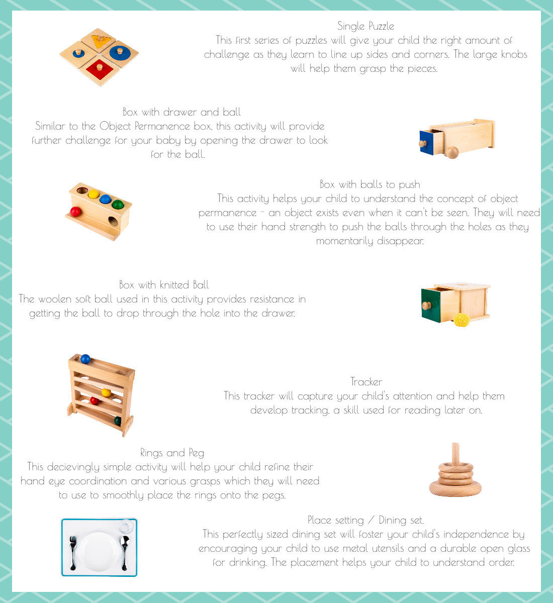 These materials will support your baby’s growing interest to put things in and take things out. Your child is exploring different shapes, cause and effect, tracking objects as they continue to develop their hand eye coordination, two hands working together, refinement of grasps and the establishment of object permanence.