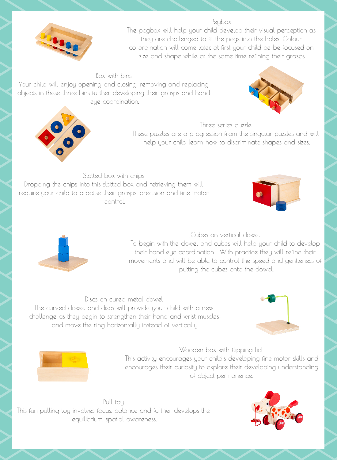 These materials will promote varying ways for your child to grasp and the use of two hands coordinating together. Your child is refining their hand eye coordination, developing new hand and wrist movements as well as refining movements that require precision and exactness.