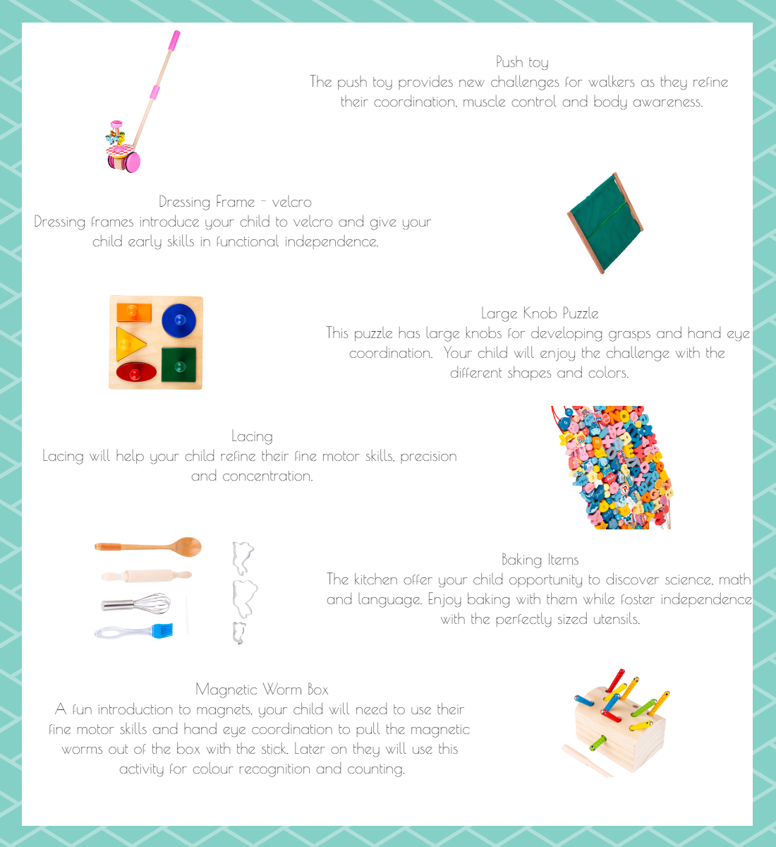 These materials provide your child with challenges to further develop their fine motor skills, muscle control to master precise and exact movement as well as their growing sense of independence.